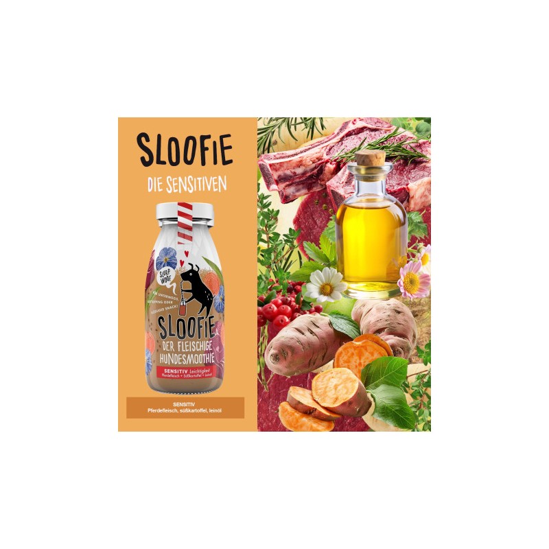 Érzékeny kutyáknak szánt Sloofie smoothie-nkat kifejezetten minden olyan kutya számára fejlesztettük ki, aki intoleranciában vagy allergiában szenved. Ez a kutyasmoothie kizárólag könnyen emészthető lóhúsból, finom édesburgonyából és egy csipetnyi lenolajból áll.